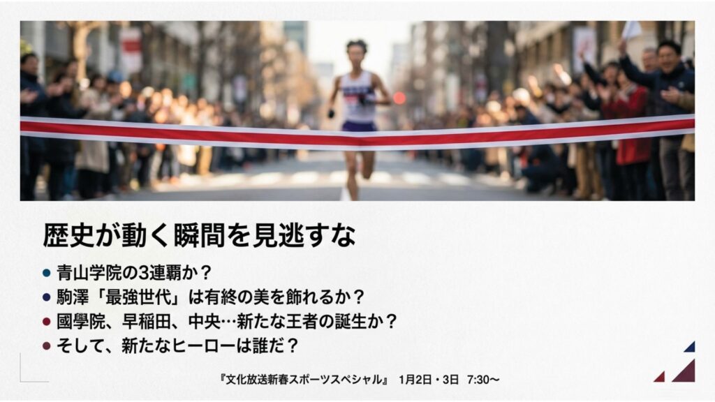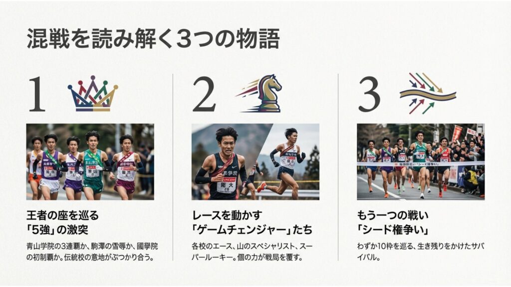 これから展開される壮大なレースプレビューの道しるべとして、まず今大会を読み解くための3つの主要なテーマを提示したい。これらの物語を軸に観戦すれば、箱根駅伝の持つ奥深いドラマをより一層楽しむことができるはずだ。