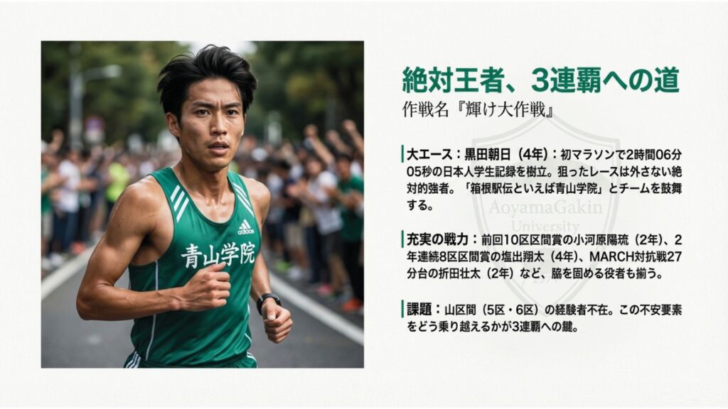 『輝け大作戦』を掲げ、絶対王者として3連覇の偉業に挑む青山学院大学。その戦力は盤石に見えるが、最大の武器と唯一のアキレス腱が同居する。絶対的エース黒田朝日が生み出すアドバンテージを、未経験の山で守り切れるのか。この一点こそが、王国の命運を分ける最大の焦点だ。