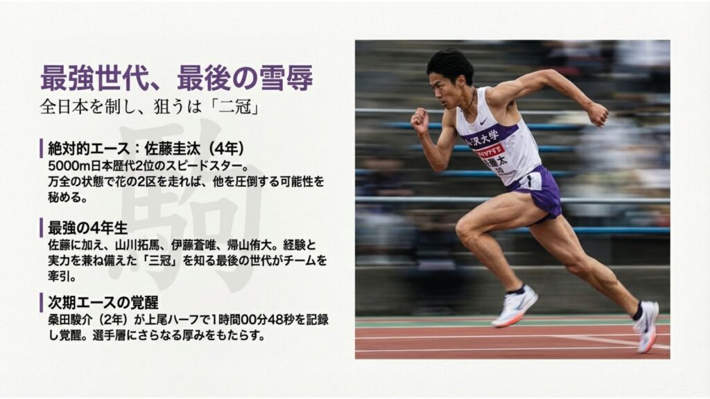 • 絶対的エース: 駒澤の切り札は、5000m日本歴代2位の記録を持つ「スピードスター」**佐藤圭汰(4年)**だ。彼が万全の状態で「花の2区」に投入されれば、その圧倒的なスピードでレースの主導権を完全に掌握する力を持つ。