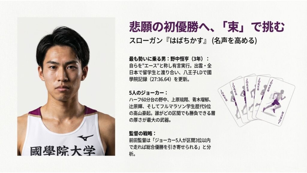 特定のスーパーエースに頼るのではない。チーム全体の総合力、「束」の力で悲願の初優勝を狙う國學院大学。その独自の戦略は、今大会の勢力図を根底から覆す可能性を秘めている。『はばちかす』(名声を高める)をスローガンに、彼らは新たな歴史を刻む。