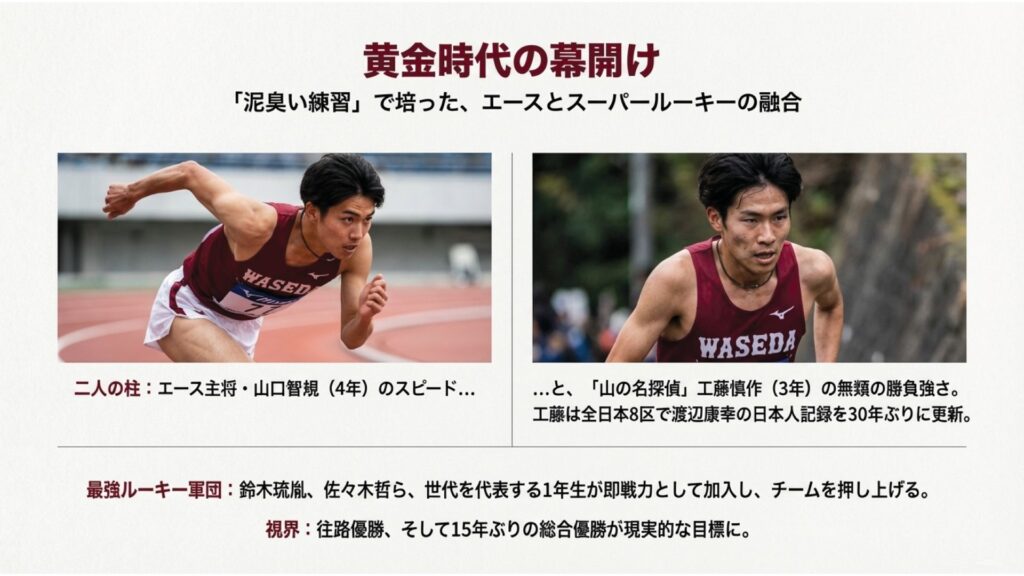 「束」で挑む國學院の戦略とは対照的に、伝統校・早稲田はエースと新世代の融合によって、新たな黄金時代の扉を開こうとしている。