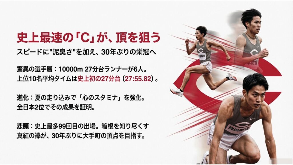 • 驚異の選手層: 今の中央大学が持つ戦力は、歴史的なレベルにある。「10000m 27分台ランナーが6人」「上位10名平均タイムは史上初の27分台 (27分55秒82)」。これらのデータは、彼らが単に速いのではなく、「史上最速」であることを雄弁に物語っている。