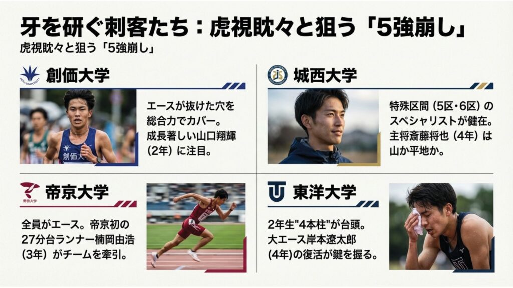 「5強」がスポットライトを浴びる一方、箱根の本当の混沌は、いわゆる「格下」とされるチームによって引き起こされる。彼らは単なる攪乱要因ではない。巨人の心臓を狙うため、影で刃を研いできた暗殺者たちだ。