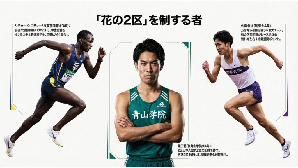 • 黒田朝日(青山学院大4年): マラソンで証明された無尽蔵のスタミナで、ライバルたちを削り取るか。2区日本人歴代2位の記録保持者として、再びこの区間を走れば記録更新の期待がかかる。