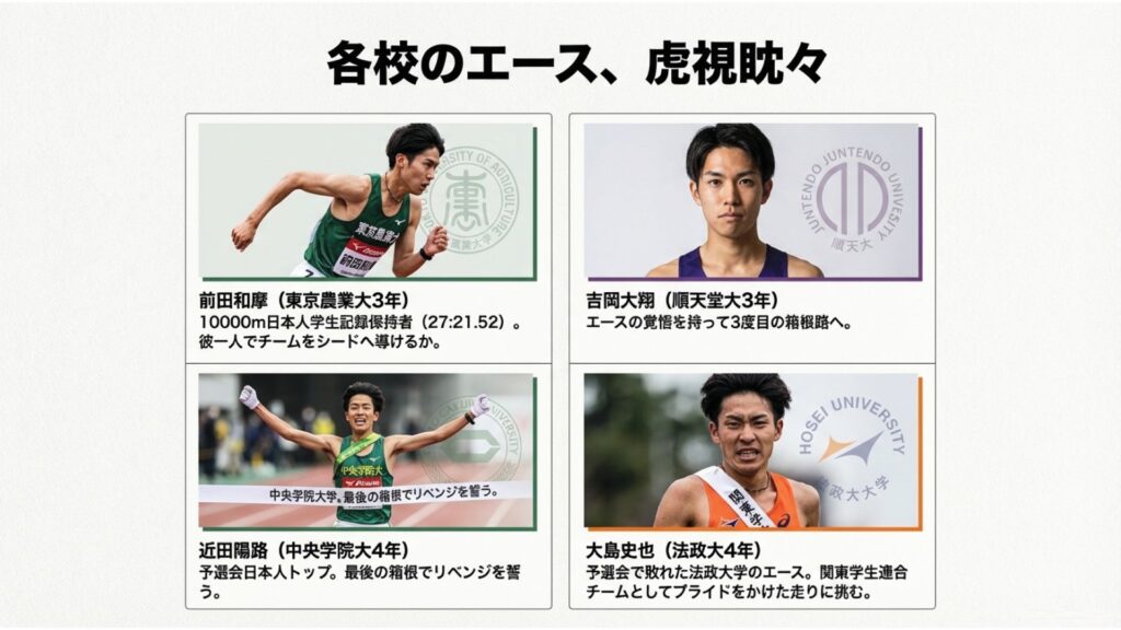 • 吉岡大翔(順天堂大3年): 名門・順天堂のエースとしての覚悟を胸に3度目の箱根路へ。チームを再びシード権へと押し上げる使命を背負う。