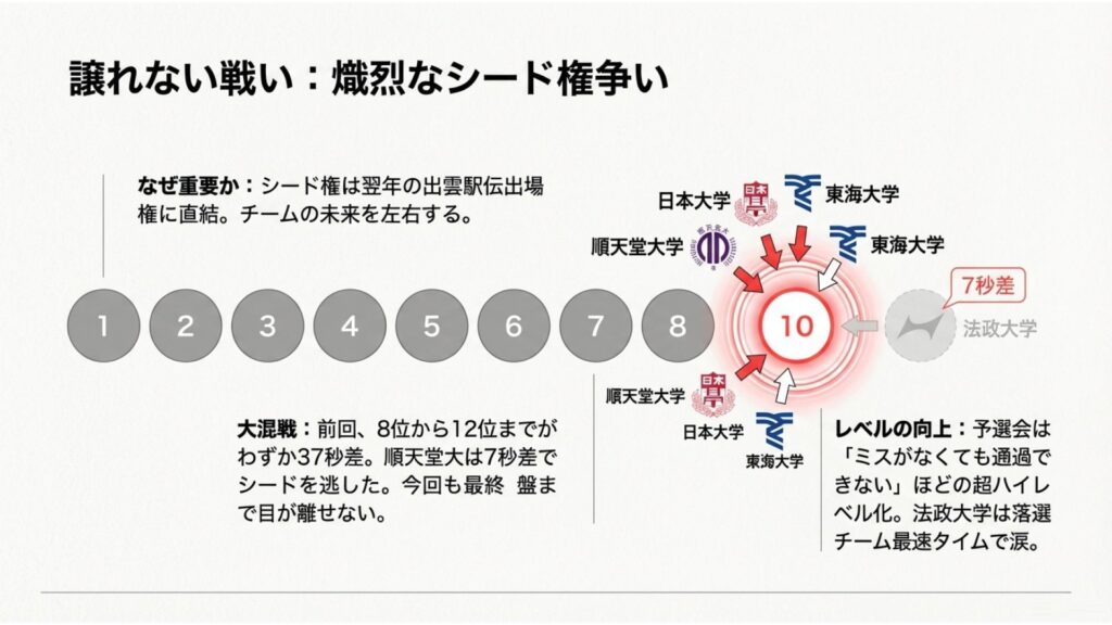 3. もう一つの戦い「シード権争い」: 翌年の出場権を巡る、わずか10校の椅子を懸けたサバイバルレース。その生き残りをかけた戦いの過酷さ。